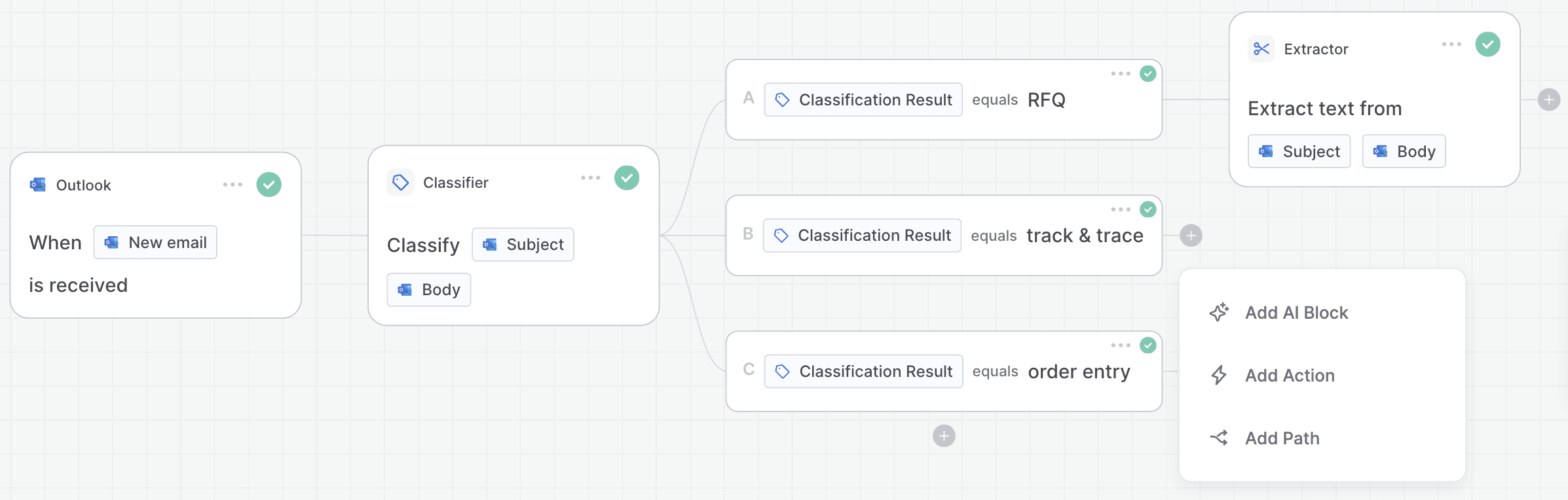 AI identifies incoming emails as track & trace request, extracts the load information and pings the TMS for the latest update on the shipment. Once the context is gathered the request can be answered automatically.